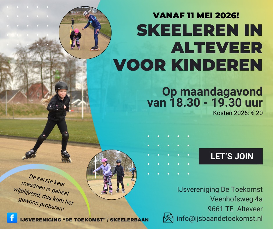Ook het komend zomer seizoen kan er weer geskeelerd worden op de skeelerbaan van ijsvereniging “De Toekomst” in Alteveer. Er kan vanaf 11 mei op maandagavond voor kinderen van 18:30 uur tot 19:30 uur geskeelerd worden onder begeleiding van Jan Henk Wubs en Marc Kampinga. Zij gaan de deelnemers trainen en de fijne kneepjes en technieken van het skeeleren leren. Ook deelnemers die het skeeleren nog niet goed beheersen zijn welkom om beter te worden in het skeeleren. Helm tijdens het skeeleren is verplicht en hand, elleboog en kniebescherming wordt sterk aanbevolen. Aansluitend om 19:30 is de baan vrij voor volwassenen om hun rondjes te draaien. De kosten voor het hele seizoen zijn € 20,- Voor meer informatie kunt u contact opnemen met Johan Zuidema 0629595368